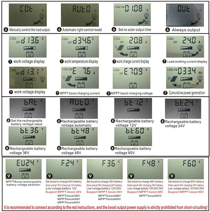 - Browsing Interface: Press the MENU button to cycle through different display interfaces (e.g., main display, float voltage, discharge reconnect, discharge stop, battery type, load work mode, work parameter display, rechargeable voltage setting, MPPT boost rechargeable battery voltage selection).