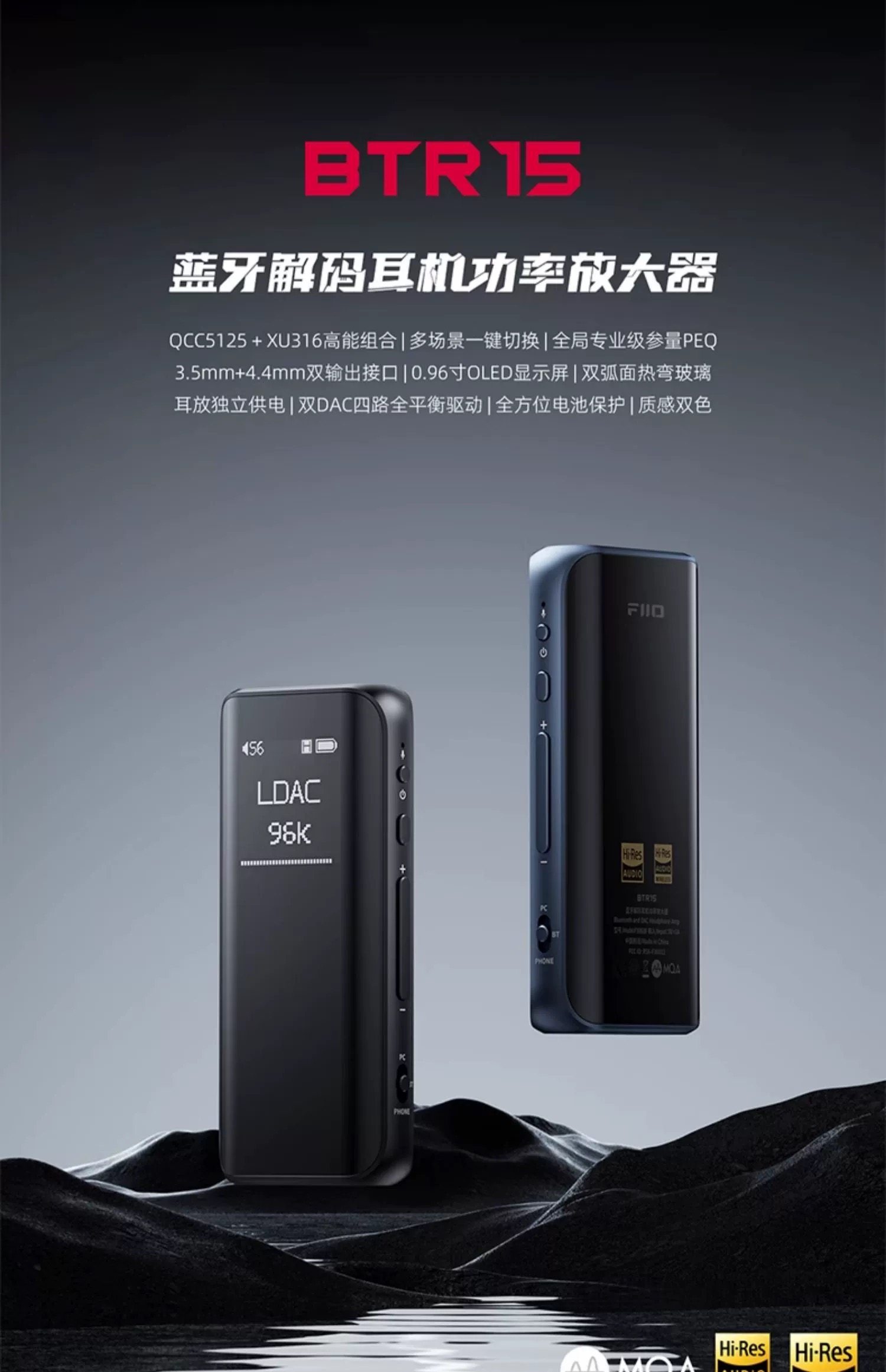 The FiiO BTR15 combines a sleek design with intuitive controls and robust connectivity. Its dual-curved glass body offers both aesthetic appeal and a comfortable grip. The device features a clear OLED display for easy navigation and status monitoring.