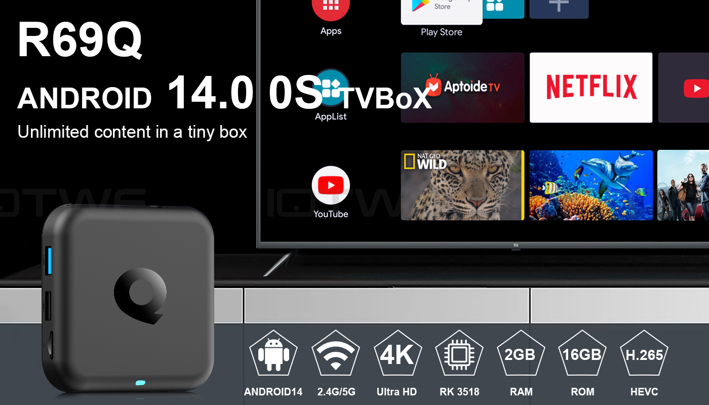 The R69Q Smart TV Box is a high-performance streaming media player designed to transform your television into a smart entertainment hub. Running on the latest Android 14 operating system, it offers a user-friendly interface, powerful Allwinner H313 Quad Core processor, and support for 4K UHD video playback at 60fps with HDR10+. With dual-band Wi-Fi (2.4G/5G), Bluetooth 5.4, and integrated Google Assistant, the R69Q provides seamless access to a wide range of streaming services, games, and applications.