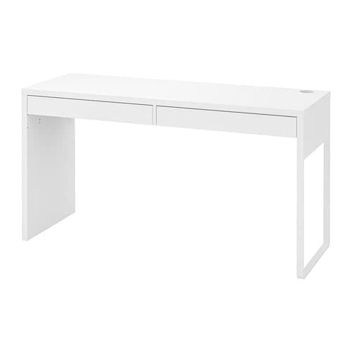 This image displays the IKEA Micke Desk, a white rectangular desk featuring two integrated drawers and a cable management opening on the top right corner. The desk has a clean, minimalist design with a solid panel leg on the left and a U-shaped steel leg on the right.