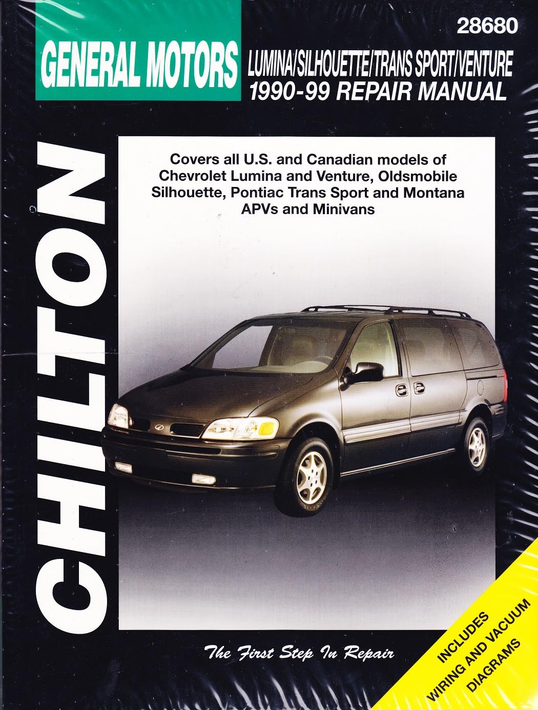 Image: Front cover of the Chilton Total Car Care Series Manual for GM Lumina APV, Silhouette, Trans Sport, and Venture models (1990-1999). The cover displays a dark-colored minivan and highlights that the manual includes wiring and vacuum diagrams.