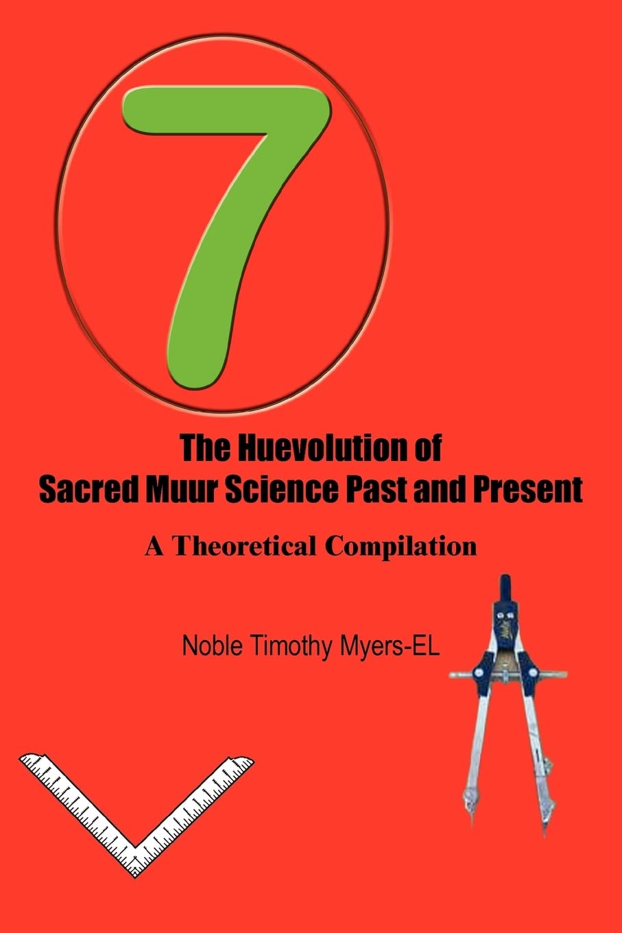 Image: The official cover of "The Huevolution of Sacred Muur Science Past and Present." The design features a prominent green number '7' encircled in red, set against a vibrant red background. The book's title and author, Noble Timothy Myers-EL, are displayed in black text. Architectural tools, specifically a drafting compass and a ruler, are depicted at the bottom, symbolizing precision and foundational principles.