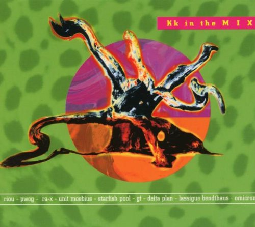 Image 1: Front cover of the Kk in the Mix Audio CD. The artwork displays an abstract, organic form in shades of orange, black, and blue, set against a vibrant green, speckled background. The album title "Kk in the Mix" is prominently displayed in the upper right corner.
