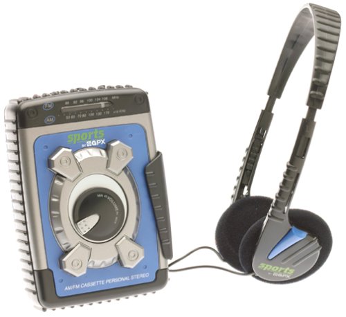 Image: The GPX C3302RS Sports Cassette Player with its cassette compartment open, revealing the internal mechanism. This view also indicates the general location for battery access, often adjacent to or within the main body of the player.