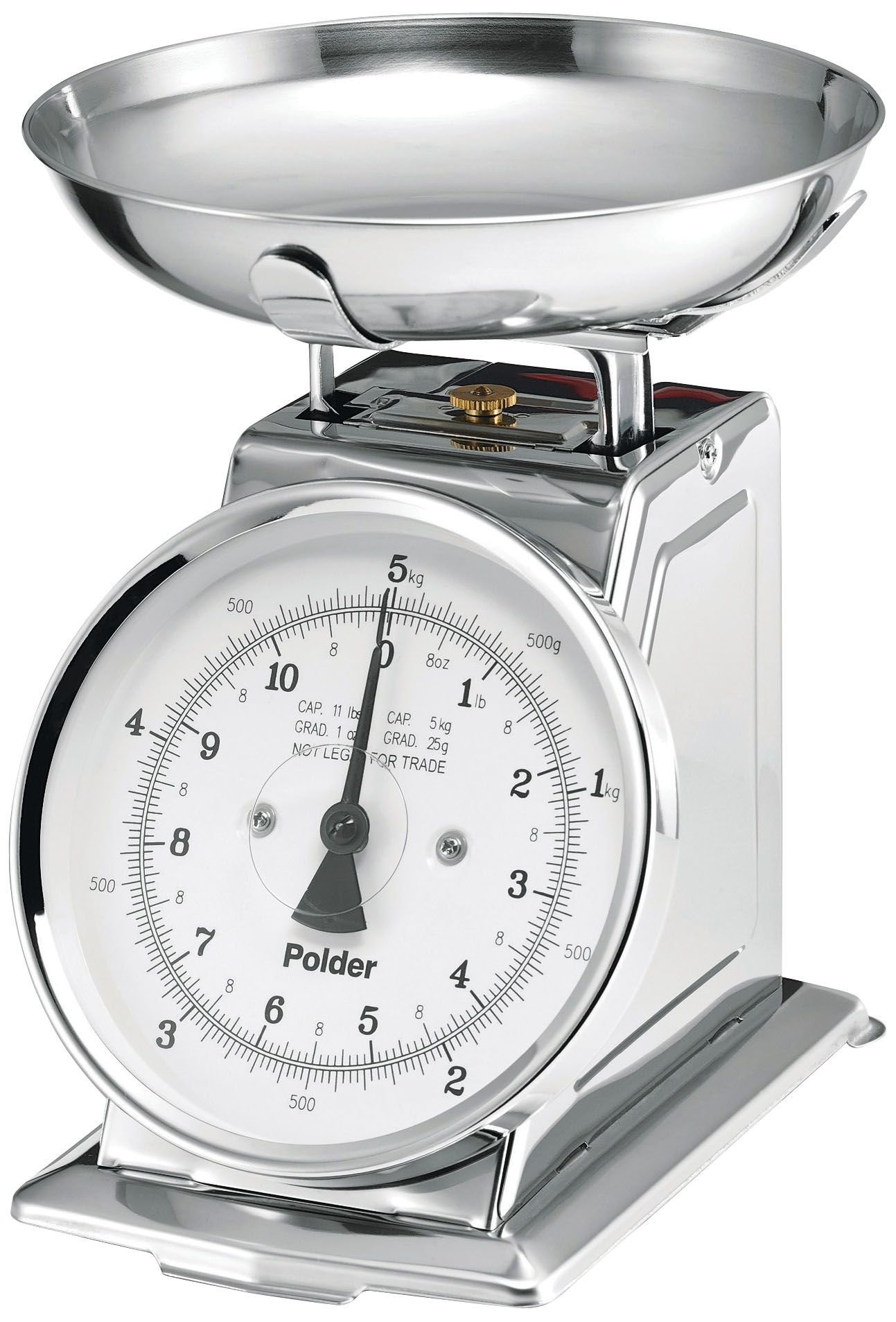 The Polder Professional Stainless Steel Analog Kitchen Scale is designed for accurate weight measurements in the kitchen. It features a durable stainless steel construction and an easy-to-read analog display.