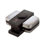 Image Description: A top-down view of the Cloer 144 Brussels Waffle Maker. The appliance features a sleek stainless steel exterior with a black handle and control knob. The deep, rectangular non-stick baking plates are visible, designed for making thick Brussels waffles. The power cord is visible at the back.