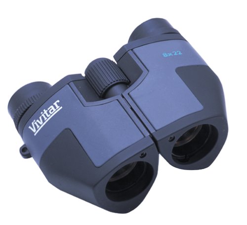 Image: The Vivitar 8x22 Classic Binocular, featuring a compact design with a central focus wheel and adjustable eyepieces. The brand name "Vivitar" is visible on the left barrel, and "8x22" is on the right barrel, indicating its magnification and objective lens diameter.