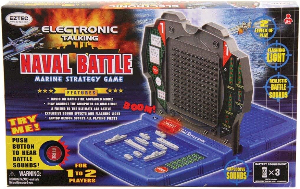 Image 1: The Eztec Electronic Naval Battle Game in its retail packaging. The image displays the game unit, various ship pieces, and highlights features such as "Electronic Talking," "Naval Battle Marine Strategy Game," "2 Levels of Play," "Flashing Light," "Realistic Battle Sounds," and "Explosive Sounds." It also shows the "Try Me" button and battery requirements.