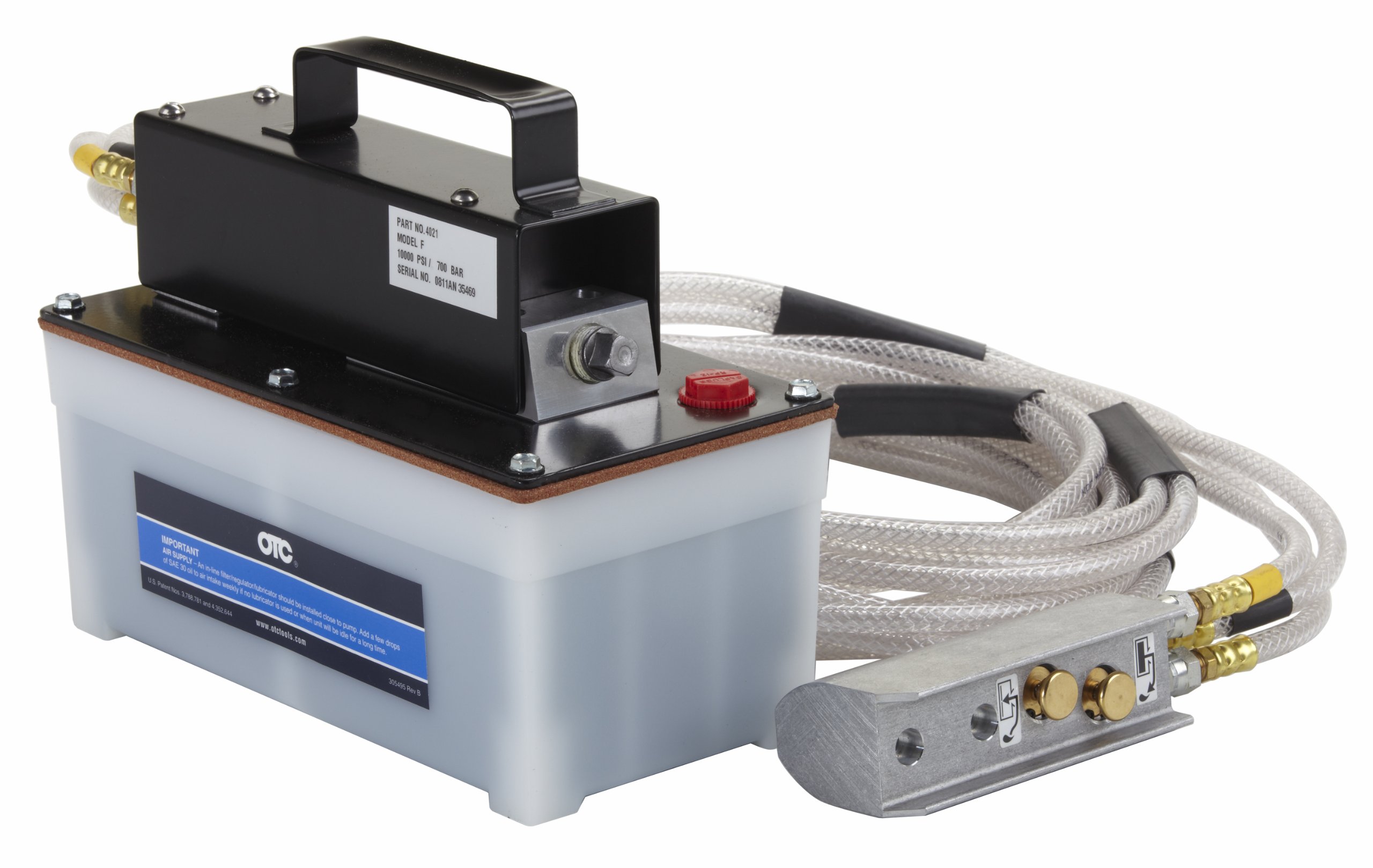 Image: The OTC 4021 Air/Hydraulic Pump with its remote control actuator. This image displays the main unit, highlighting its compact design and the attached remote for operational convenience.