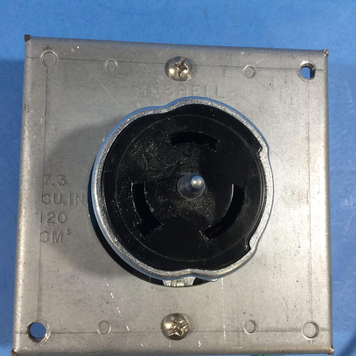 Figure 1: Front view of the Hubbell CS8269 Flush Mount Twist Lock Receptacle, showing the 3-prong twist-lock configuration within its metal mounting box.