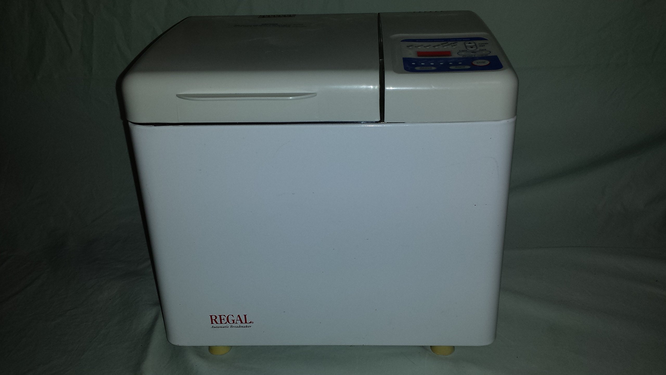 Image 1: Top view of the REGAL Automatic Breadmaker, showing the removable bread pan, kneading paddle, and the control panel with various program selections and crust control options.