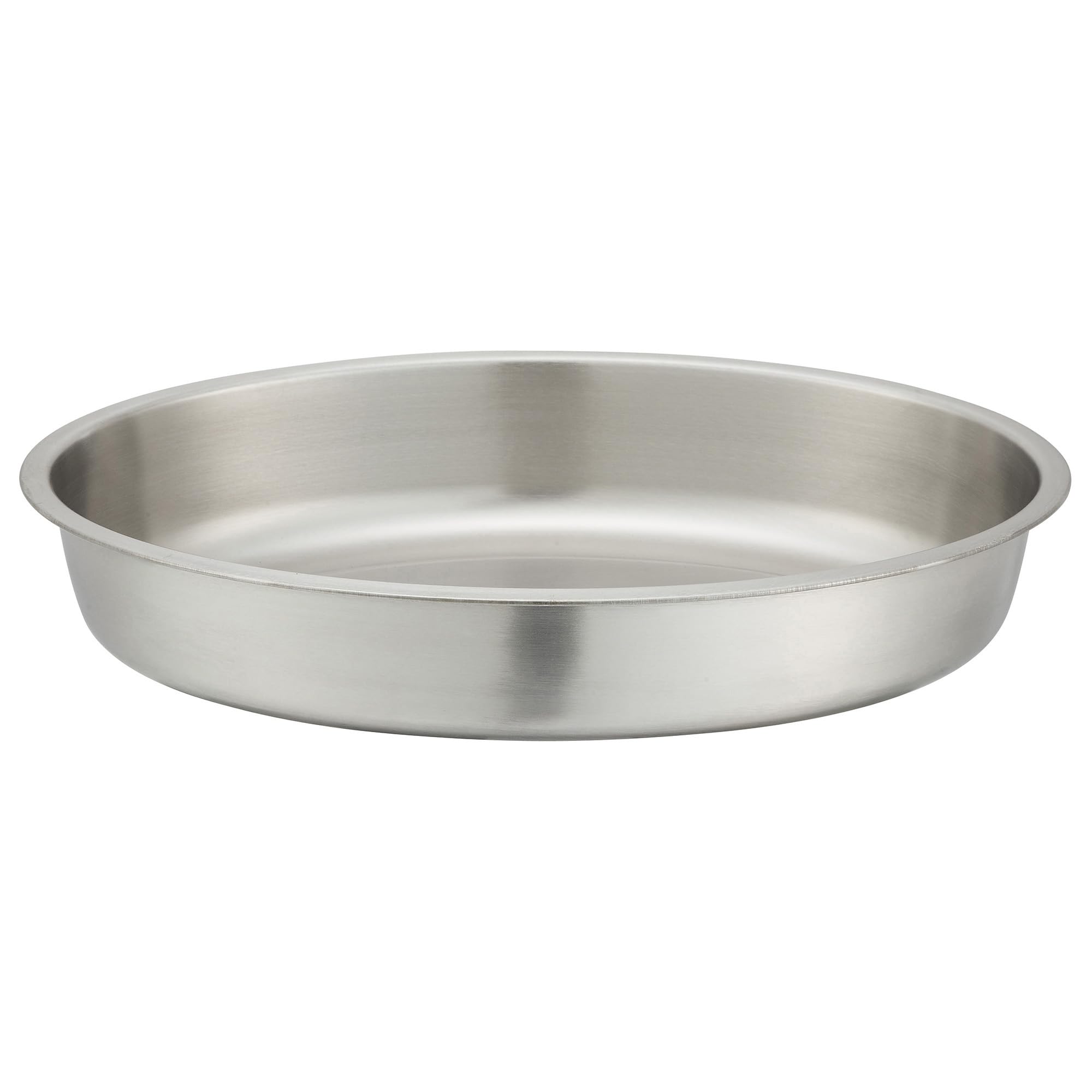 Image: The Winco Water Pan 202-WP, an oval stainless steel pan, shown ready for use.