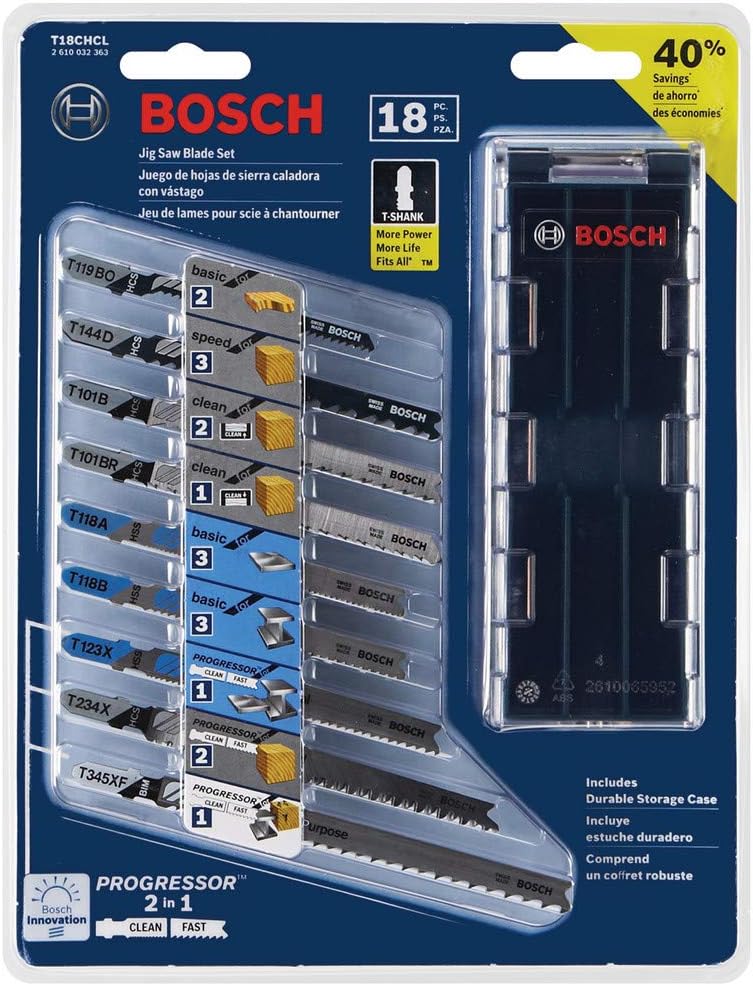 - 18-piece T-shank jigsaw blade set: Offers an ideal assortment for wood, metal, and all-purpose cutting.