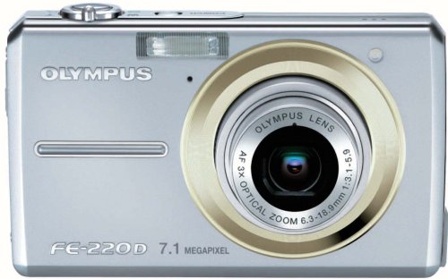 The OLYMPUS CAMEDIA FE-220D features a 7.1-megapixel sensor and a 3x optical zoom lens, housed in a slim 20mm stainless steel body. Its intuitive design ensures straightforward operation for all users.