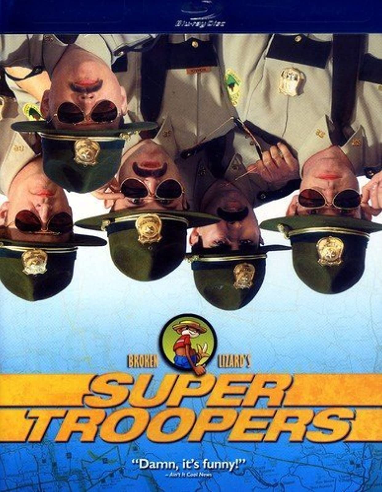 Figure 2.1: Super Troopers Blu-ray Disc Cover. The cover art displays five highway patrol officers, inverted, wearing sunglasses and mustaches, with their hats resting on their heads. The movie title "SUPER TROOPERS" is prominently displayed below them, along with the "Broken Lizard's" logo and the tagline "Damn, it's funny!".
