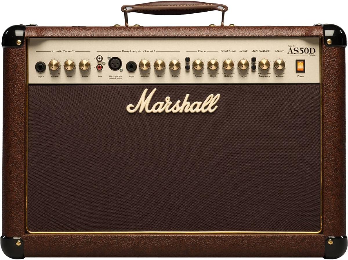 Image 1.1: Front view of the Marshall AS50D Acoustic Soloist Amplifier, showcasing its control panel and speaker grille.