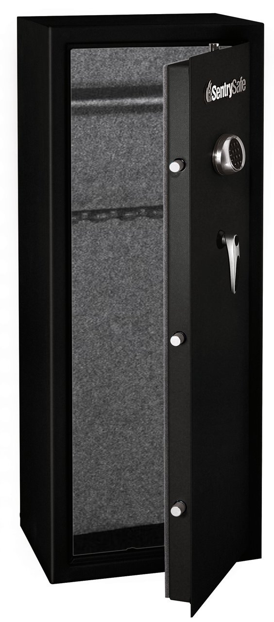 This manual provides essential instructions for the safe and effective use of your SentrySafe G1455E Electronic Lock Safe. This 14-gun capacity security safe features an electronic lock, solid steel pry-resistant door with concealed hinges, and a carpeted interior designed to protect contents. It includes 3 steel live locking bolts and 3 dead bolts for enhanced security. The safe meets or exceeds the California Department of Justice requirements for an approved firearm safety device under CA Penal Code section 12087, et seq., and incorporates a hardened steel plate to protect against drill attacks.