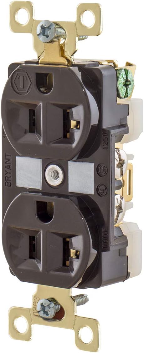 Image: Front view of the Bryant Electric 20 Amp, 125V, Nema 5-20R, Duplex Receptacle. It features a brown housing with two outlets, brass mounting straps, and visible wiring terminals on the side.
