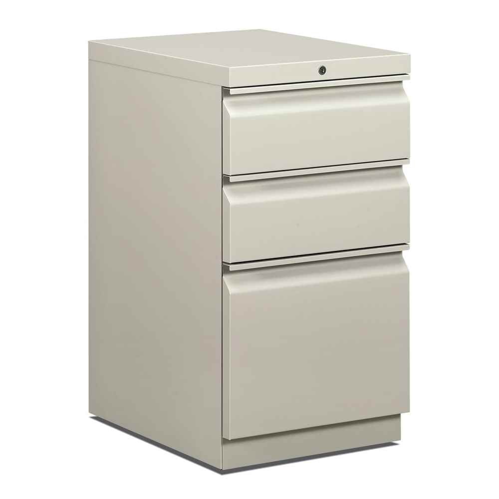 This image displays the HON Mobile Pedestal, a light gray, three-drawer filing cabinet. It features two smaller box drawers at the top and one larger file drawer at the bottom, suitable for legal or letter-sized documents. A security lock is visible on the top right of the unit, designed to secure all drawers. The pedestal is equipped with casters for mobility, though they are not visible in this specific view. The overall design is functional and suitable for office environments.