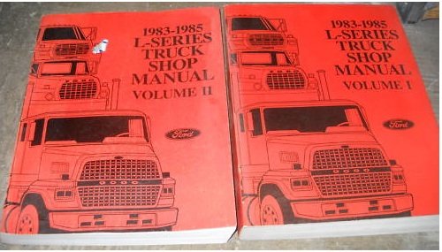 Image: Front covers of the Ford L-Series Heavy Truck Shop Service Manual, indicating Volume I and Volume II. The covers display the title "1983-1985 L-SERIES TRUCK SHOP MANUAL" and feature an illustration of a Ford L-Series truck.