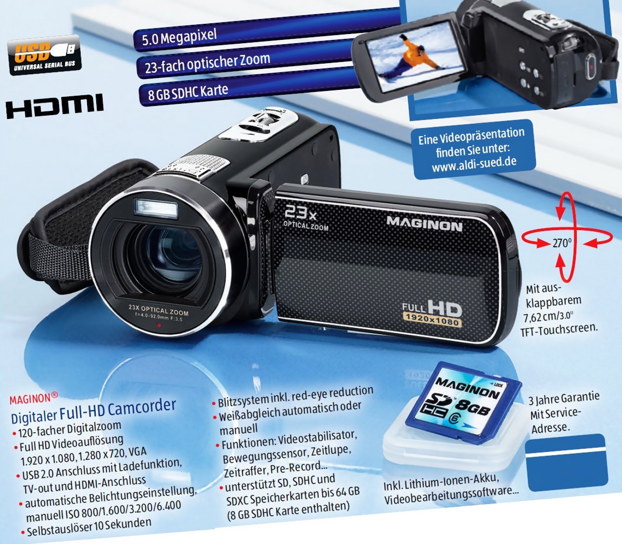 This image displays the MEDION Life X47023 Full HD Camcorder from various angles, highlighting its key features. The main view shows the camcorder with its lens, flash, and hand strap. An inset image on the left shows an 8GB SD card, indicating memory expansion. Text overlays point out "5.0 Megapixel" for photo resolution and "23x Optical Zoom" for the lens capability. Another inset on the top right shows the camcorder with its 7.62 cm (3.0 inch) TFT-Touchscreen display open and rotated, displaying a video scene. A red arrow graphic illustrates the 270-degree rotation capability of the touchscreen. The "FULL HD 1920x1080" logo is visible on the side of the camcorder's body. The "HDMI" and "USB" logos are also present, indicating connectivity options.