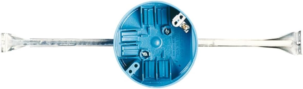 The Carlon B620HG-UPC is a 4-inch diameter, 2-1/4-inch deep electrical box with a 20 cubic-inch capacity, specifically designed for new construction. It features a durable PVC construction and an adjustable bar hanger for secure mounting between joists. This box is suitable for supporting ceiling fans and heavy light fixtures.