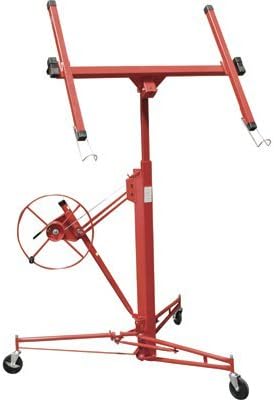 Figure 1: The Ironton Drywall and Panel Hoist, fully assembled, showcasing its red steel frame and manual crank system.