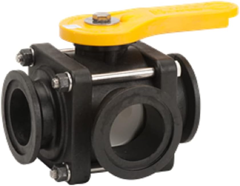The Banjo MV220SL is a manual three-way ball valve constructed from polypropylene with a full port design, suitable for various fluid handling applications. It features 2-inch manifold flanges for inlet and outlet connections.