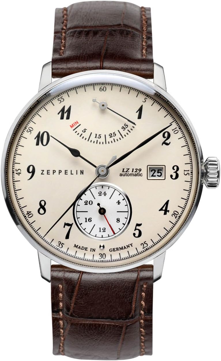 The Graf Zeppelin LZ129 Hindenburg watch features a precise automatic movement, a power reserve indicator, and a 24-hour subdial, encased in a classic design.