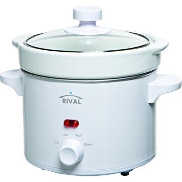 Image: The Rival 2-Quart Slow Cooker, showing the white heating base, removable ceramic pot, and tempered glass lid. The control dial is visible on the front of the base.
