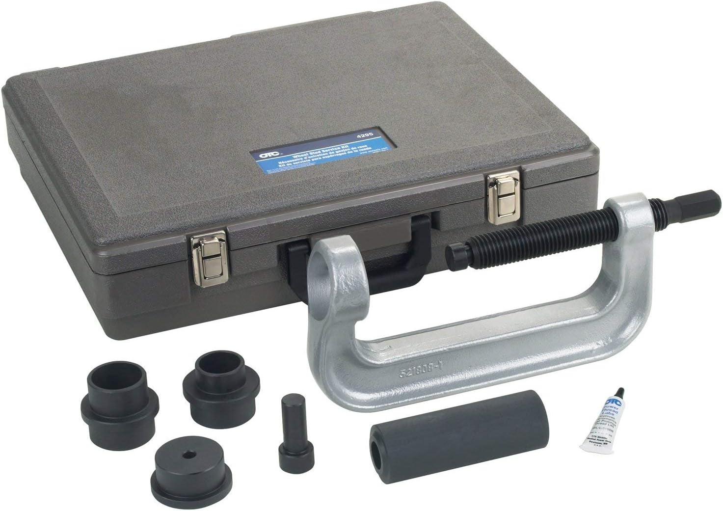 Image: The OTC 4295 Wheel Stud Service Kit, including the C-frame with forcing screw, various adapters, and a durable blow-molded plastic storage case.