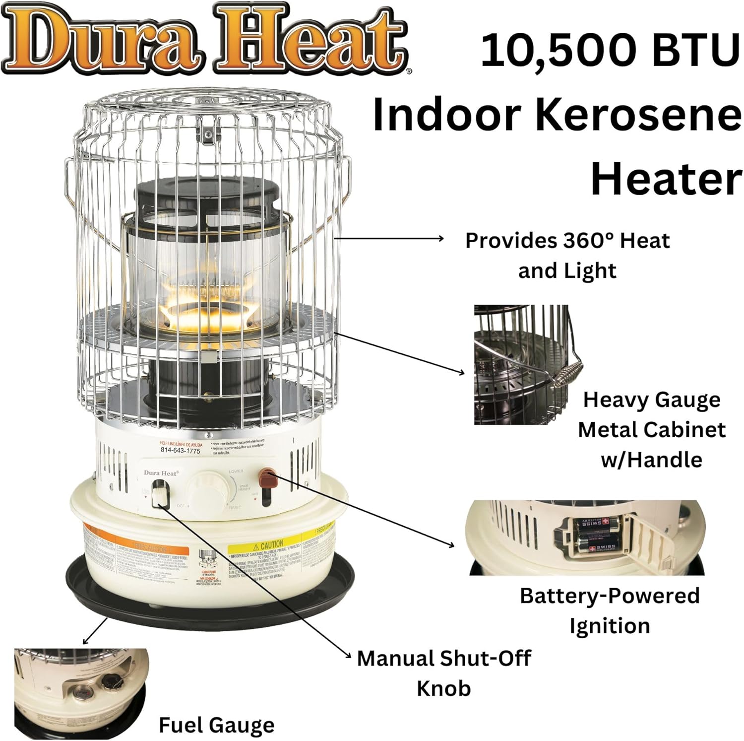The Dura Heat DH1051 is a compact indoor kerosene heater designed to provide both convective and radiant heat. It offers 360-degree heating with an output of 10,500 BTUs, capable of heating approximately 450 square feet. This heater operates efficiently, providing up to 15 hours of heat on only 1.1 gallons of 1-K kerosene fuel. Its portable design makes it suitable for various indoor spaces.