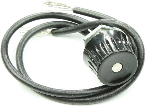 This image displays the SELECTA SS109-BG rotary switch, featuring a black knob and two insulated wires with exposed conductors, ready for electrical connection.