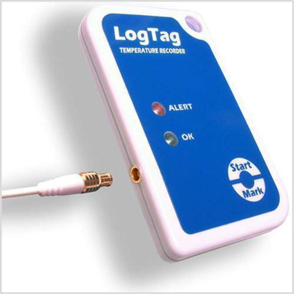Image: The LogTag TREX-8 temperature recorder with the ST100S-15 remote probe securely connected to its input port.