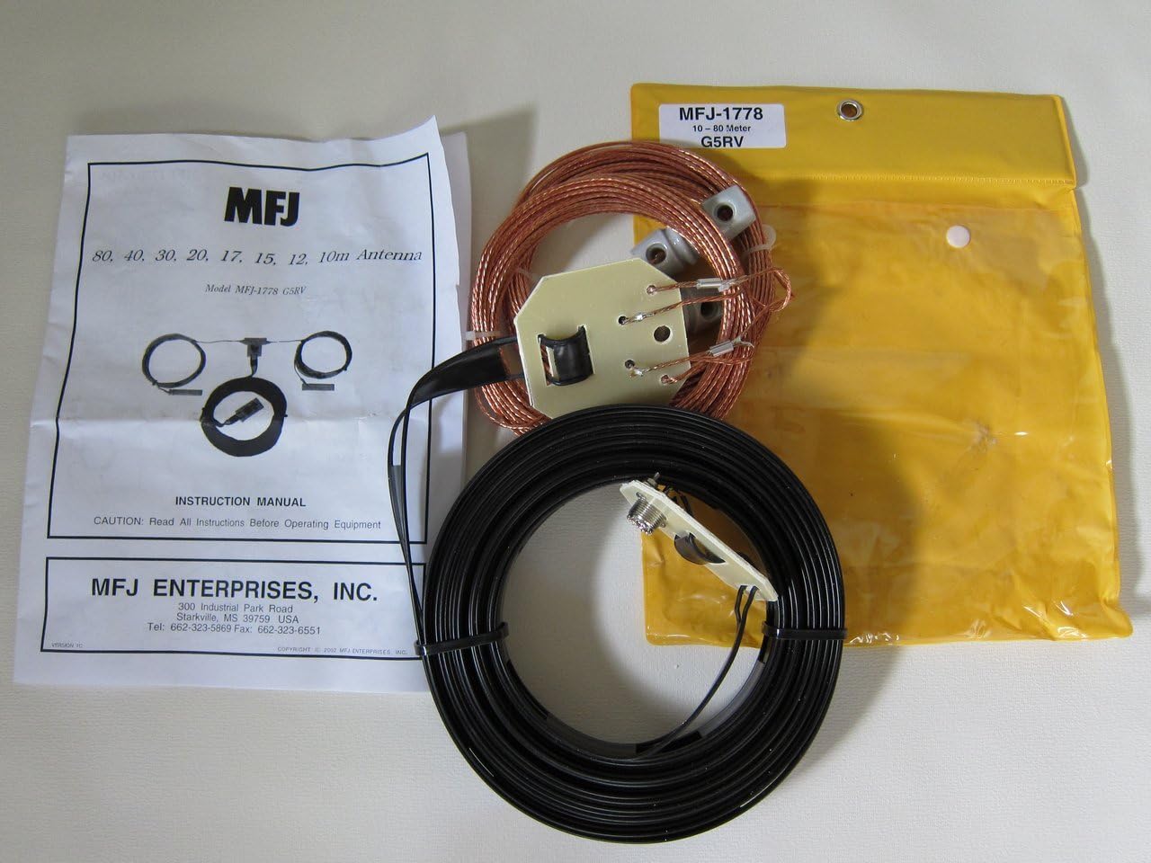 Image: Contents of the MFJ-1778M G5RV Junior Wire Antenna package, showing the coiled wire elements, the matching section with SO-239 connector, and the printed instruction manual.