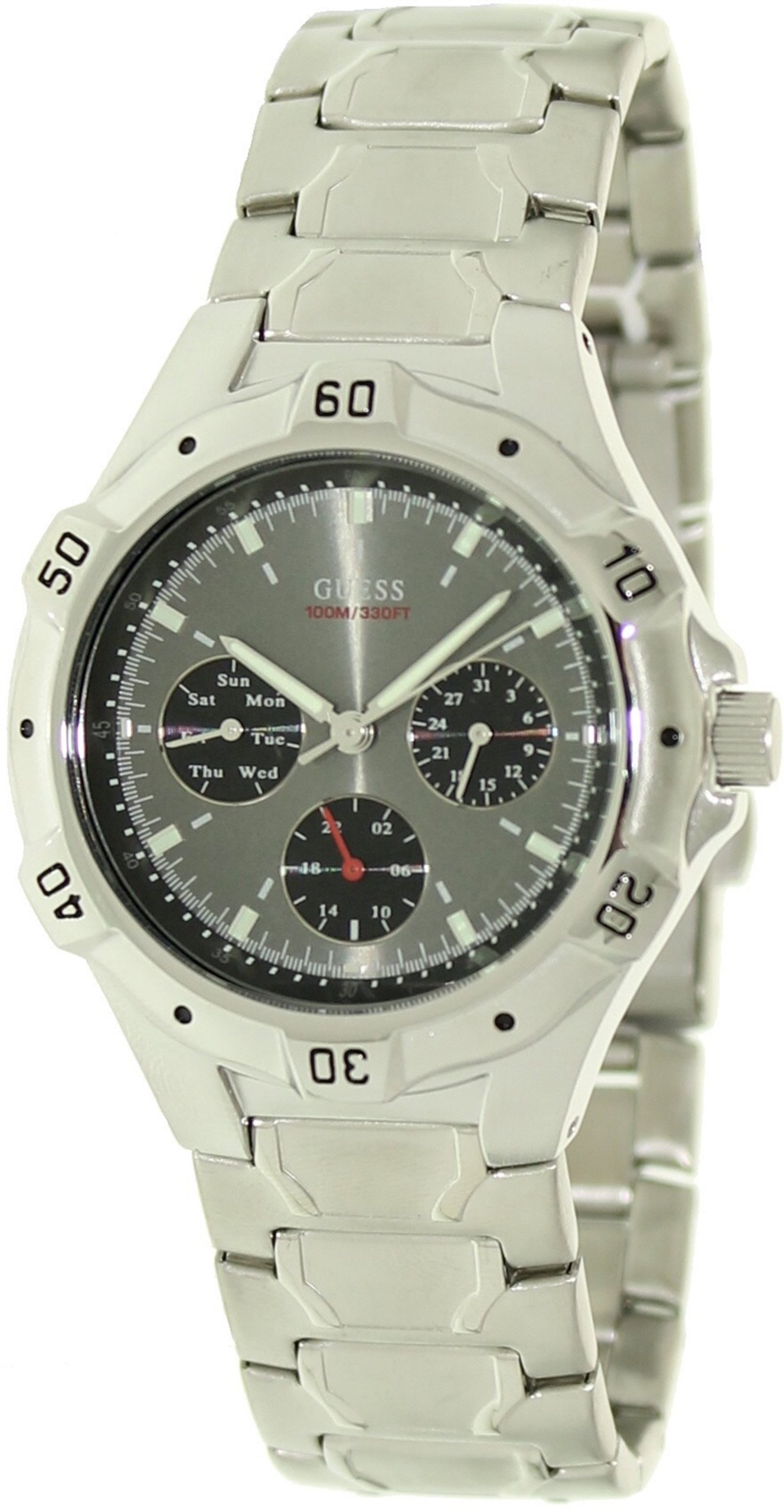 Image: The GUESS G85386G Men's Quartz Watch, featuring a silver dial and a stainless steel bracelet.