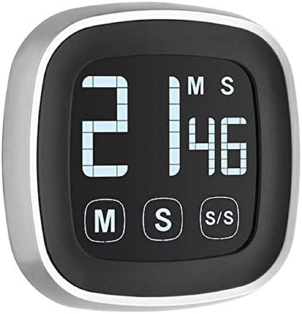 Image showing the front of the TFA 38.2028.01 Digital Kitchen Timer, featuring its touch screen display and compact black design.