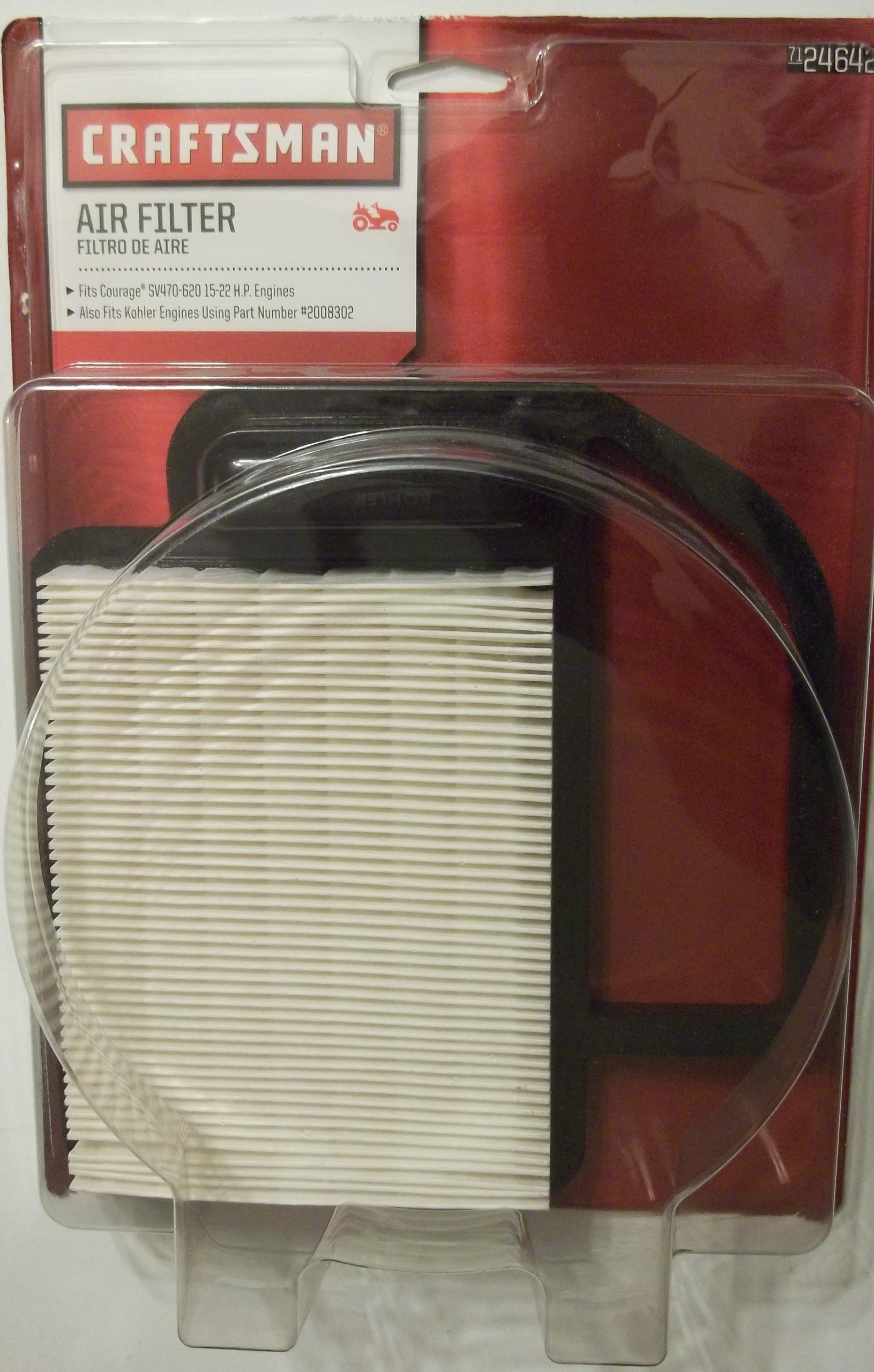 Image 1: Sears Craftsman Air Filter 24642 in its retail packaging. The filter element is visible, along with a black gasket. The packaging indicates compatibility with Courage SV470-620 and Kohler engines.