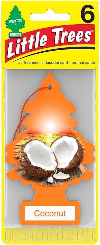 Image: Front view of the LITTLE TREES Pina Coconut air freshener packaging. The package displays the iconic tree shape, the "LITTLE TREES" brand logo, and an illustration of coconuts, indicating the scent.