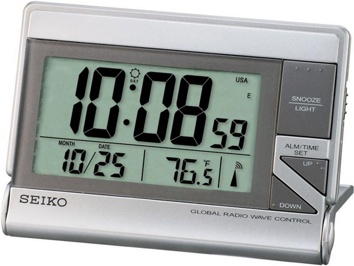 The Seiko QHR024S is a modern digital alarm clock featuring a clear LCD display, radio wave control for accurate timekeeping, and essential functions like alarm, snooze, and temperature display.