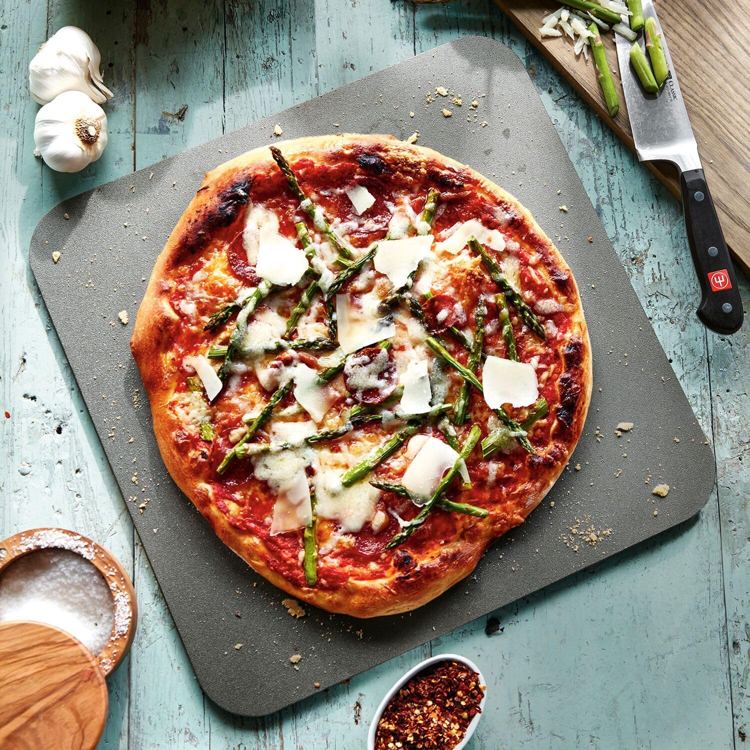 Image: A freshly baked pizza with asparagus and cheese on the Sur La Table Baking Steel, ready to be served.
