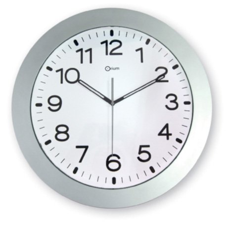 The Orium 11687 is a large wall clock designed for clear visibility. It features a durable ABS casing, a white dial with prominent black numbers, and a protective mineral glass cover.