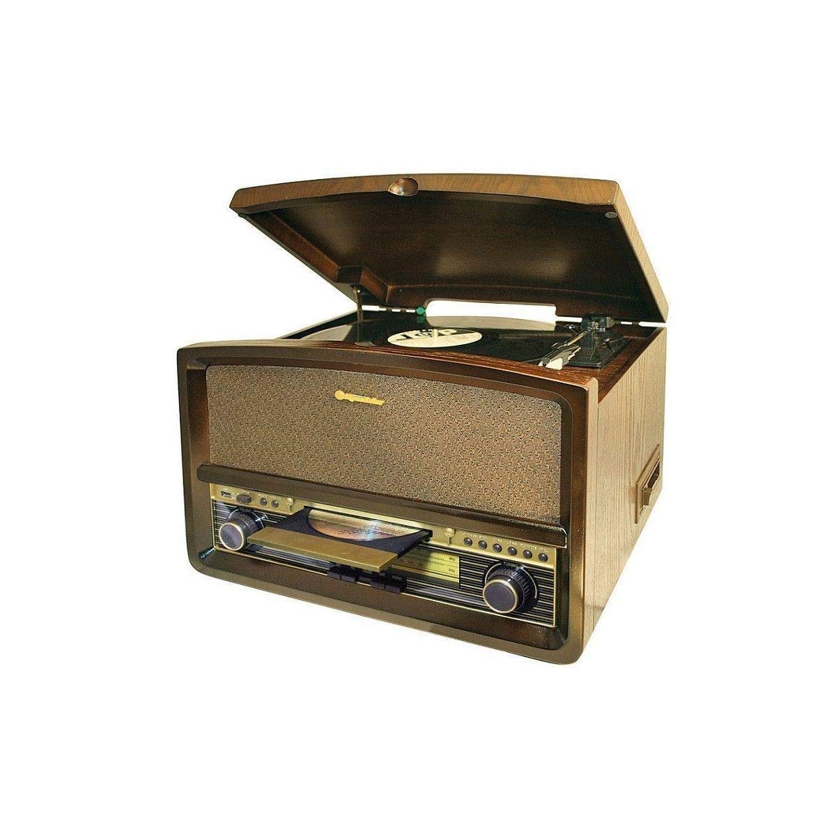 - Function Selector: Switches between Turntable, CD, Radio, Cassette, and USB modes.