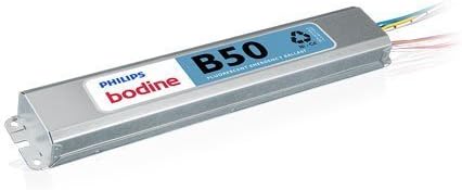 Figure 1: The Bodine B50 Emergency Ballast. This image shows the compact, rectangular metal housing of the ballast with wiring extending from one end. The label clearly displays "PHILIPS bodine B50 FLUORESCENT EMERGENCY BALLAST" along with a recycling symbol.