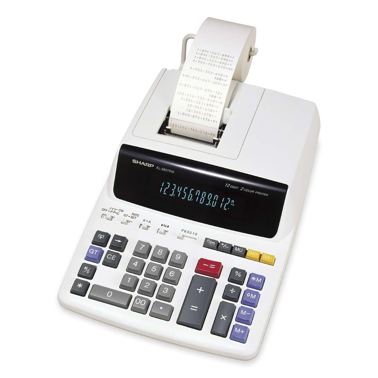 Figure 1: Sharp EL-2607RIII Desktop Calculator. This image displays the calculator's front, showing its 12-digit fluorescent display, numeric keypad, and function buttons.