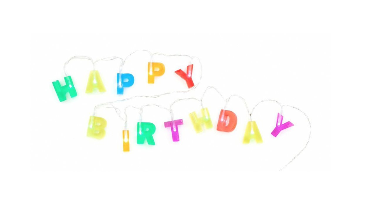 Figure 1: Kikkerland Birthday String Lights spelling 'HAPPY BIRTHDAY' with the battery pack visible.