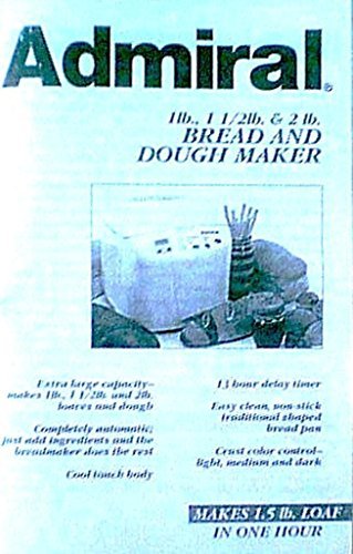 The Admiral Bread Machine is designed for automatic bread and dough making, offering convenience and versatility. It features an extra-large capacity, capable of making 1 lb., 1 1/2 lb., and 2 lb. loaves and dough. The machine is fully automatic, requiring only the addition of ingredients for the breadmaker to complete the process. It includes a 13-hour delay timer, an easy-clean non-stick traditional shaped bread pan, and crust color control (light, medium, and dark). The exterior features a cool-touch body for safety.