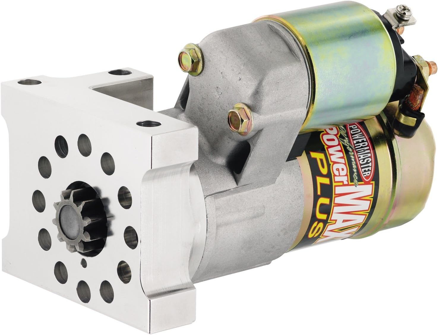Figure 1: Powermaster 9112 Powermax Starter. This image displays the Powermaster 9112 Powermax Starter. It features a silver-colored main body with a gold-colored solenoid attached. The mounting plate, also silver, has multiple bolt holes and a central gear for engaging the engine's flywheel.
