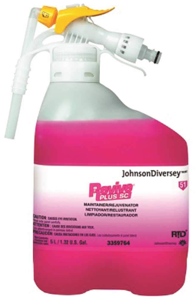 The Diversey REVIVE PLUS SC Maintainer/Rejuvenator is a specialized floor care product designed to repair microscopic scratches and restore a glossy appearance to hard-surface floors. This 5-liter solution is formulated for daily cleaning and maintenance, preventing browning out and enhancing floor aesthetics when burnished correctly. It is suitable for use with high-speed burnishers (1500 to 2000+ RPM).