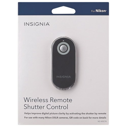 Image shows the Insignia Wireless Shutter Control device, a small black remote with a silver shutter button, displayed within its retail packaging. The packaging indicates compatibility with Nikon cameras.